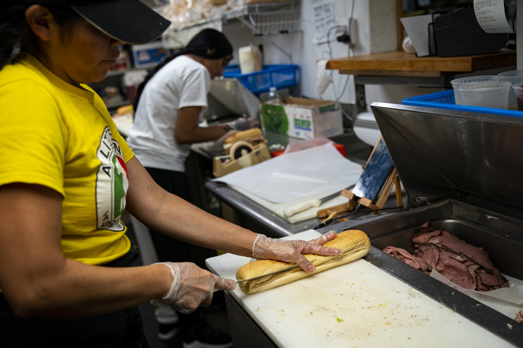 工人们在华盛顿特区联合市场区的一家餐厅里准备三明治,时间是8月30日。