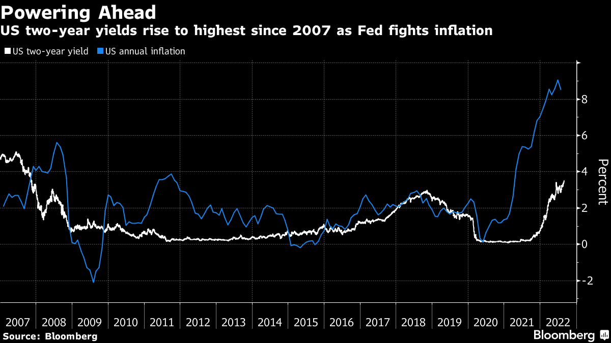 8月的数据出现在一个受打击的债券市场中,10年期国债收益率本周上涨超过20个基点,达到约3.25%,而2年期利率触及自2007年以来的最高水平。