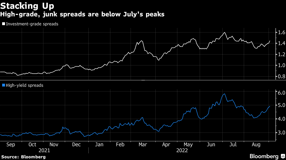 在股票和国债市场的动荡中,企业债券相对平静。尽管投资级和高收益债券的利差在杰克逊霍尔峰会后有所扩大,但仍然远低于盛夏的峰值。