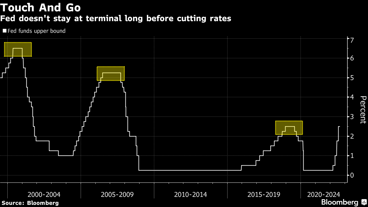 “保持在那个水平”这一评论在最近的美联储历史背景下很有趣。中央银行在2018年底将利率提高到2.5%,仅仅六个月后又降低了利率。2006年至2007年的加息周期以美联储将利率保持在终点利率超过一年结束,而2000年的行动则有七个月的暂停。