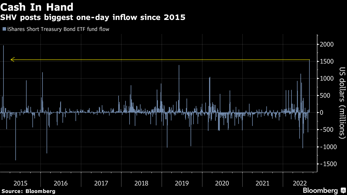 与此同时,总资产为210亿美元的iShares短期国库券ETF(SHV)--彭博智库的Ira Jersey指出,通常被用作货币市场替代品--本周看到自2015年以来最大的单日资金流入。
