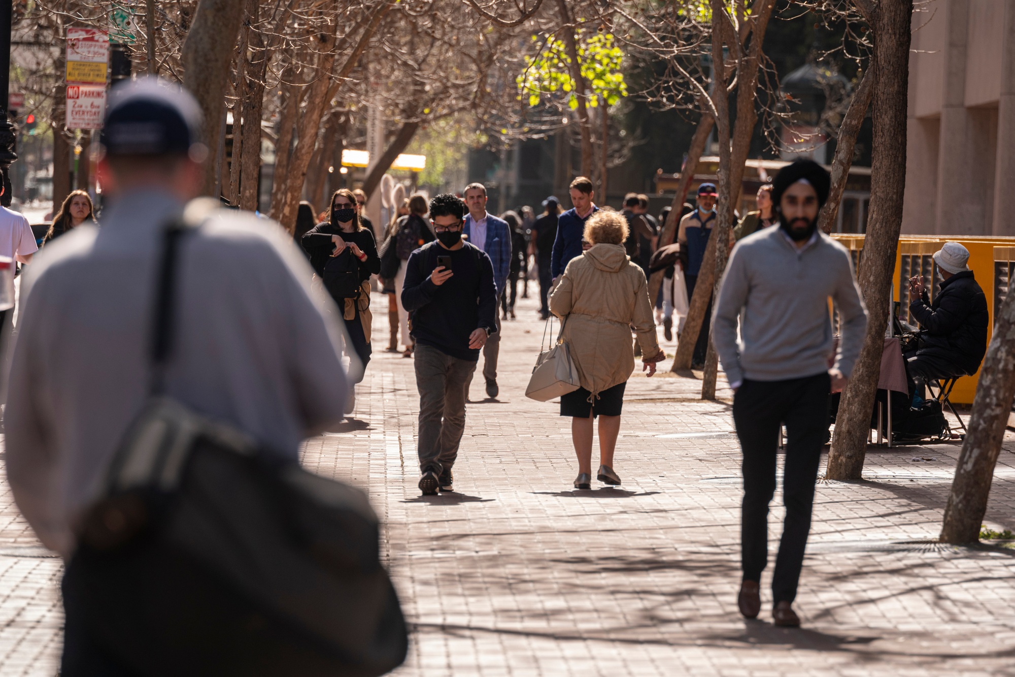 2022年3月,旧金山市场街上的行人。从该市迁出的人数已经减少到疫情前的水平以下。
