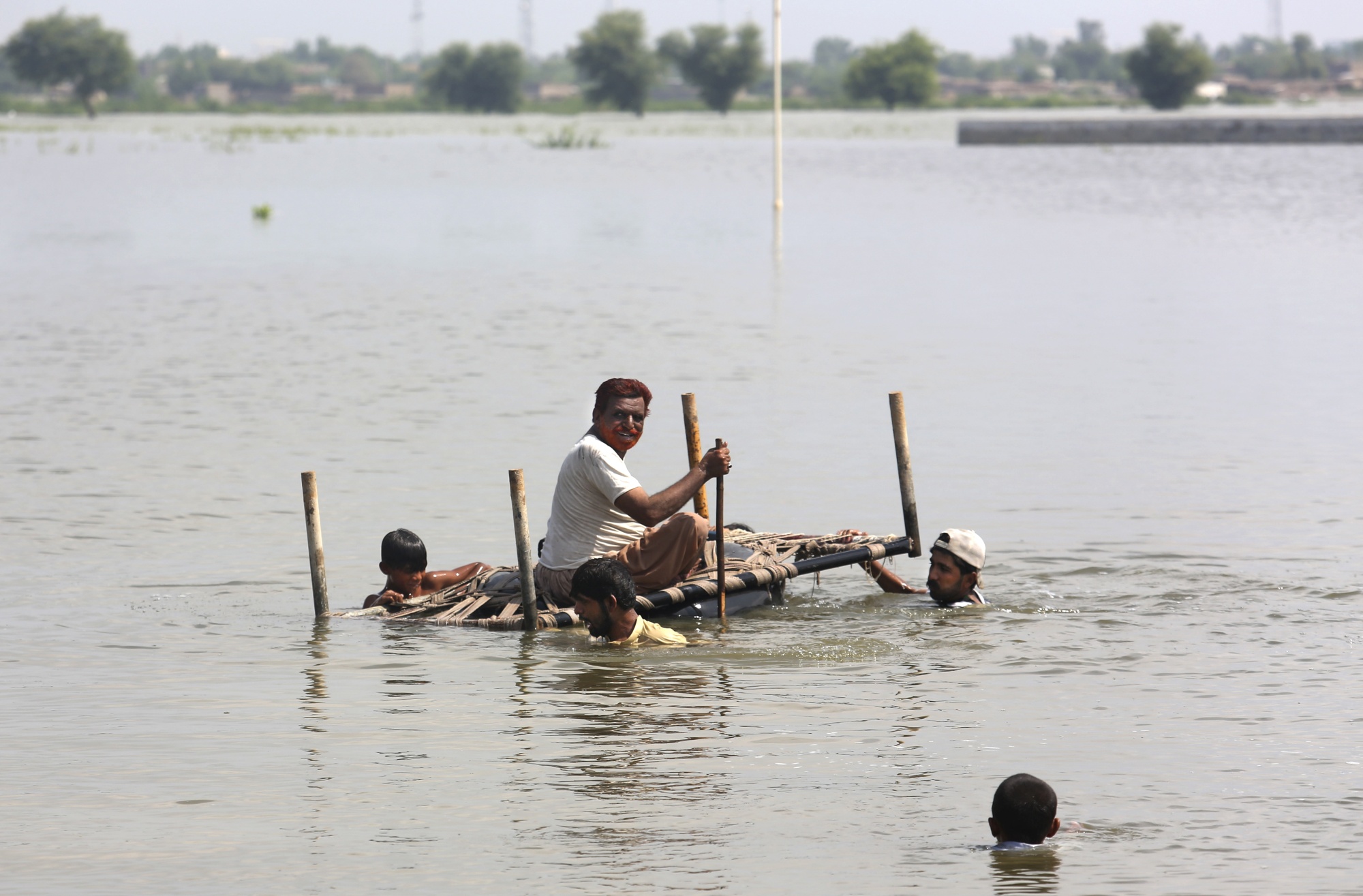 人们在俾路支斯坦省的家中使用小床从附近被洪水淹没的家中打捞物品,9月3日。