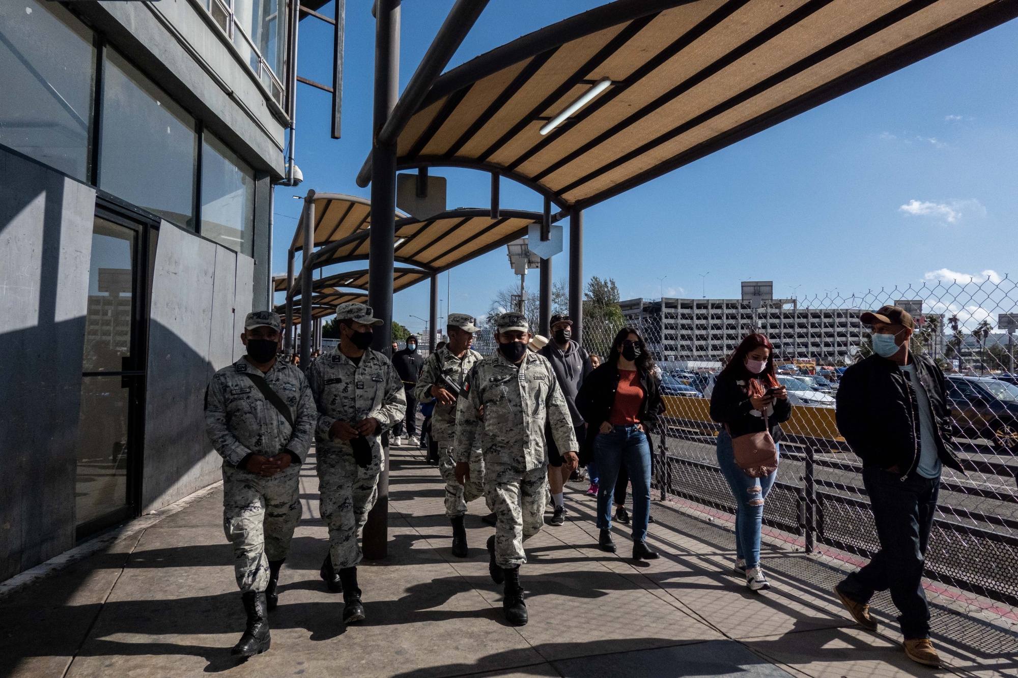 墨西哥国家警卫队成员在墨西哥蒂华纳的圣伊西德罗口岸边境过境桥上巡逻。