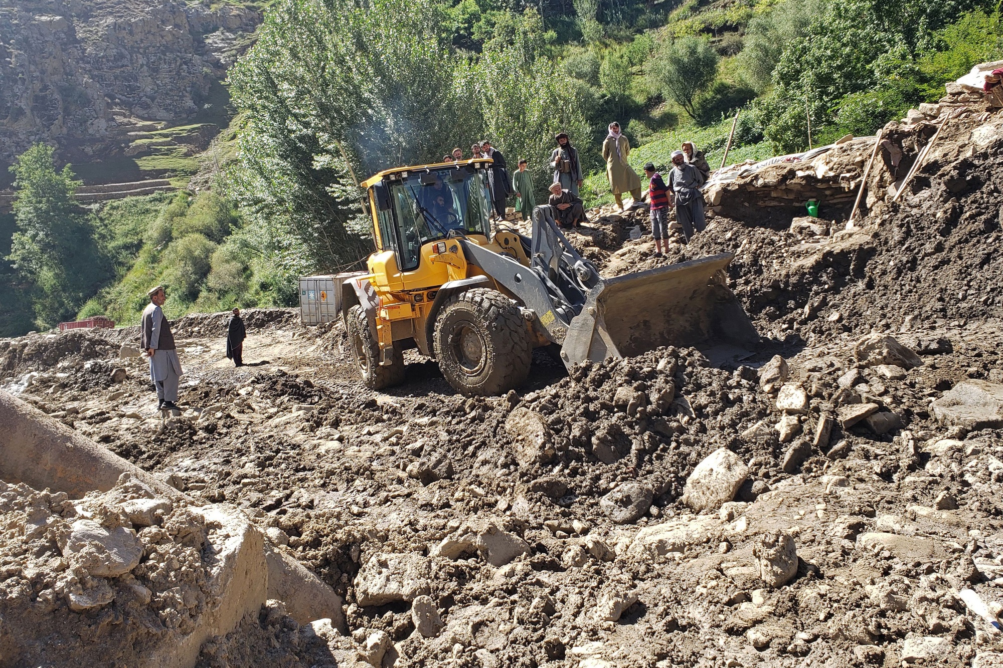 一辆推土机正在清理阿富汗帕日什省因最近的山洪而受损的道路,时间是8月29日。