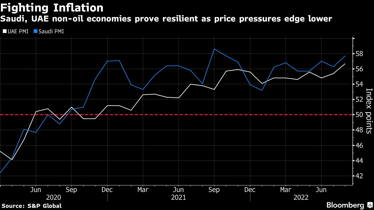 **增长引擎:**两个最大的海湾阿拉伯经济体——沙特阿拉伯和阿拉伯联合酋长国——已经看到通胀压力减轻,同时商业活动正在加速。