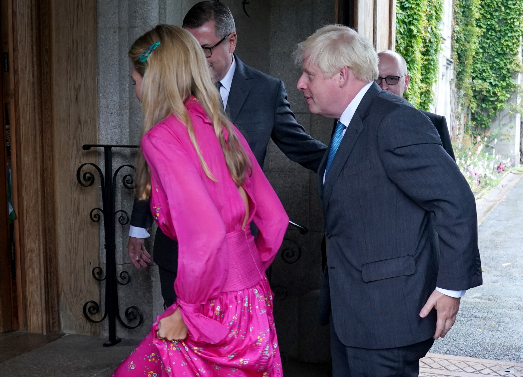 现任首相鲍里斯·约翰逊和他的妻子凯丽·约翰逊抵达巴尔莫勒堡与伊丽莎白二世女王会面。