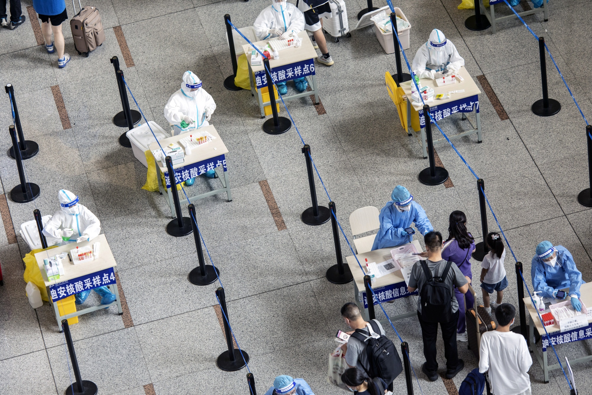 抵达的旅客在中国昆明长水国际机场排队接受新冠病毒检测,时间为8月8日。