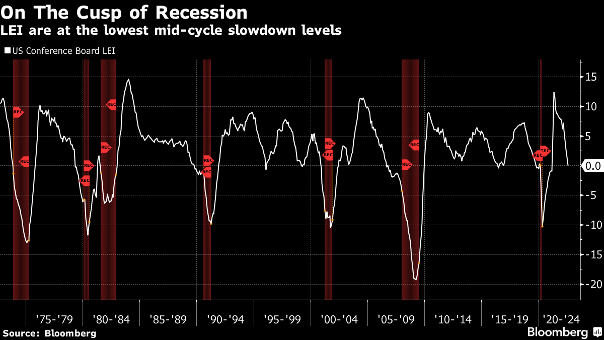 基本情况仍然是美国经济陷入衰退的情况。就领先经济指标而言,我们正处于将中期增长放缓与衰退区分开的水平。并且随着线条的斜率急剧下降,要想在这里停止需要一个显著的转变。因此,股价的下跌并不完全是关于利率的。这是由于增长的基本下降趋势在本季度有所减轻,但只是暂时的。