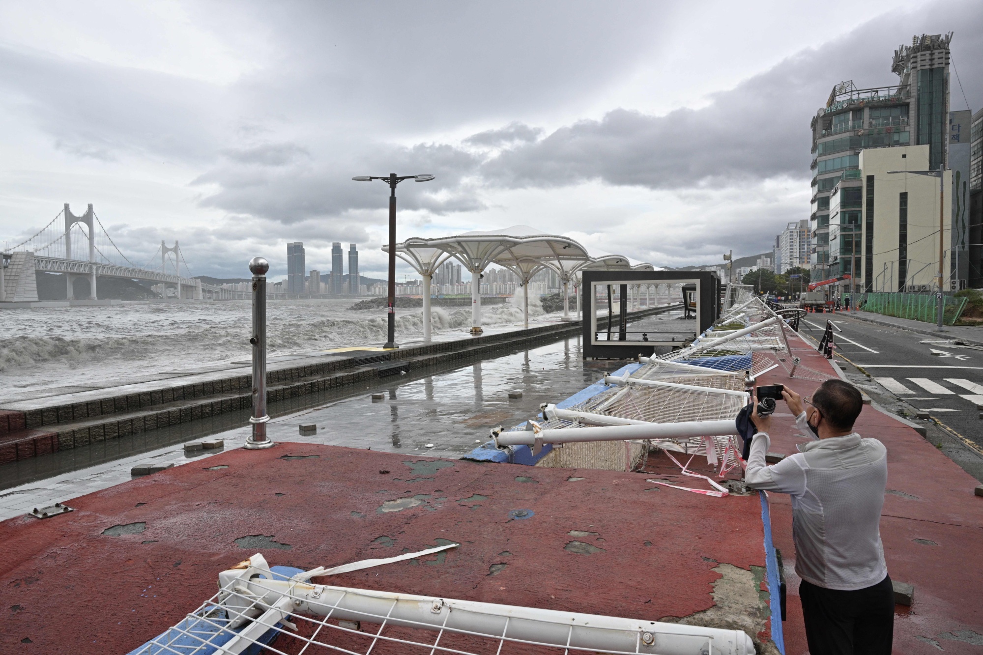 一名男子在9月6日台风“辛纳姆诺”经过釜山后拍摄了损坏的照片。摄影师:安东尼·华莱士/法新社/盖蒂图片社