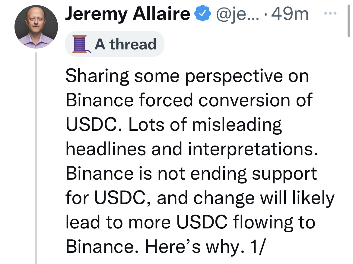 就价值而言,Circle似乎得出了相同的结论。首席执行官Jeremy Allaire在周二的一条推文中表示,任何“单方面转换现有客户资产”的交易所在美国受监管市场可能不会被接受,而且肯定不会是他选择的商业计划 — 即使他相信,USDC最终可能会受益。