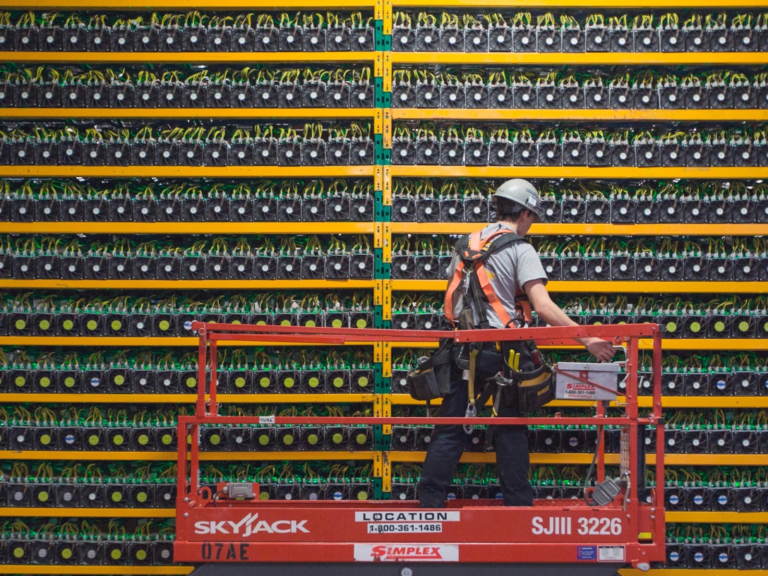一名技术员在魁北克省圣伊亚辛斯检查比特币挖矿的背面。