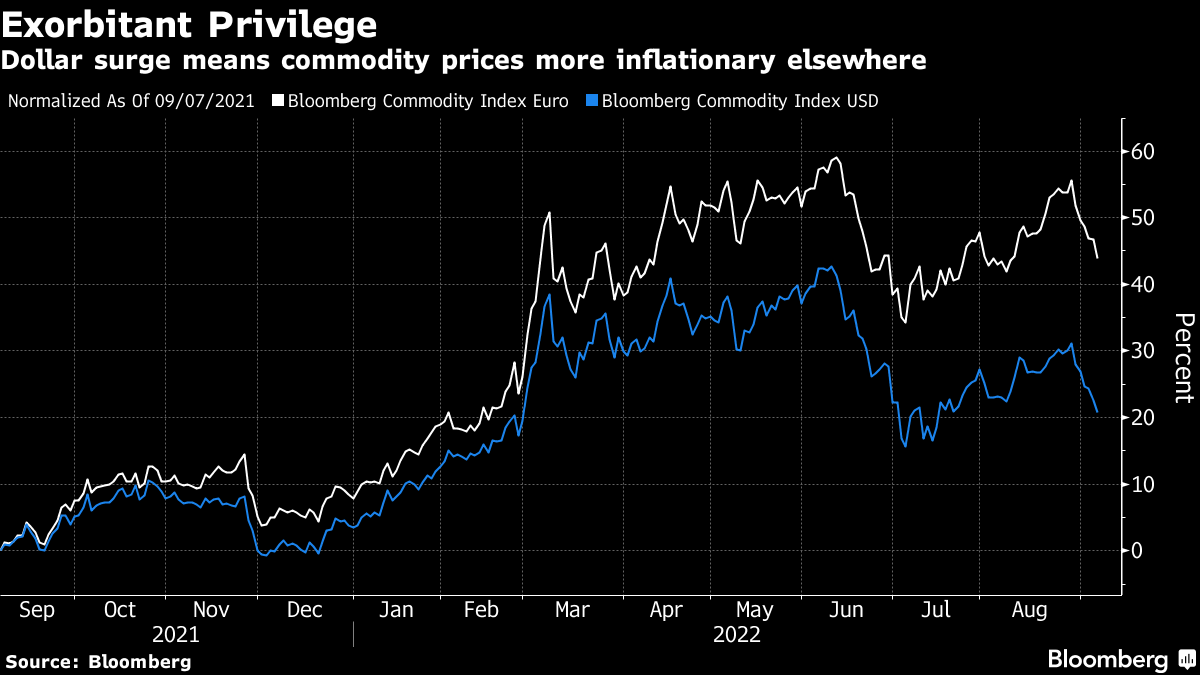 毫无疑问,彭博的大宗商品指数自三月份的激增后已经趋于稳定并下降,因为美联储加息,而各国经济适应了俄罗斯对乌克兰的战争影响。与此同时,其他经济体的大宗商品成本要高得多,这要归功于美元走强的影响。结果可能是美国出口滞胀,同时通过比其他主要经济体更快地降低成本压力,使自己有机会摆脱这一陷阱。