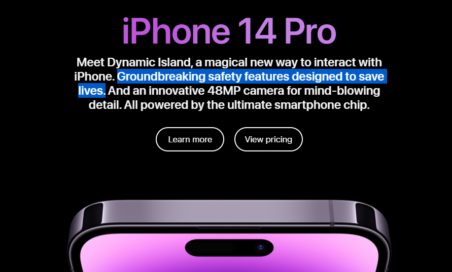 iPhone 14 Pro 营销。来源:苹果苹果产品拯救你生命的理念肯定会在未来几个月甚至几年内深入人心,这将使许多消费者产生放弃他们的 iPhone 或 Apple Watch 是一种不负责任的行为的明显印象。