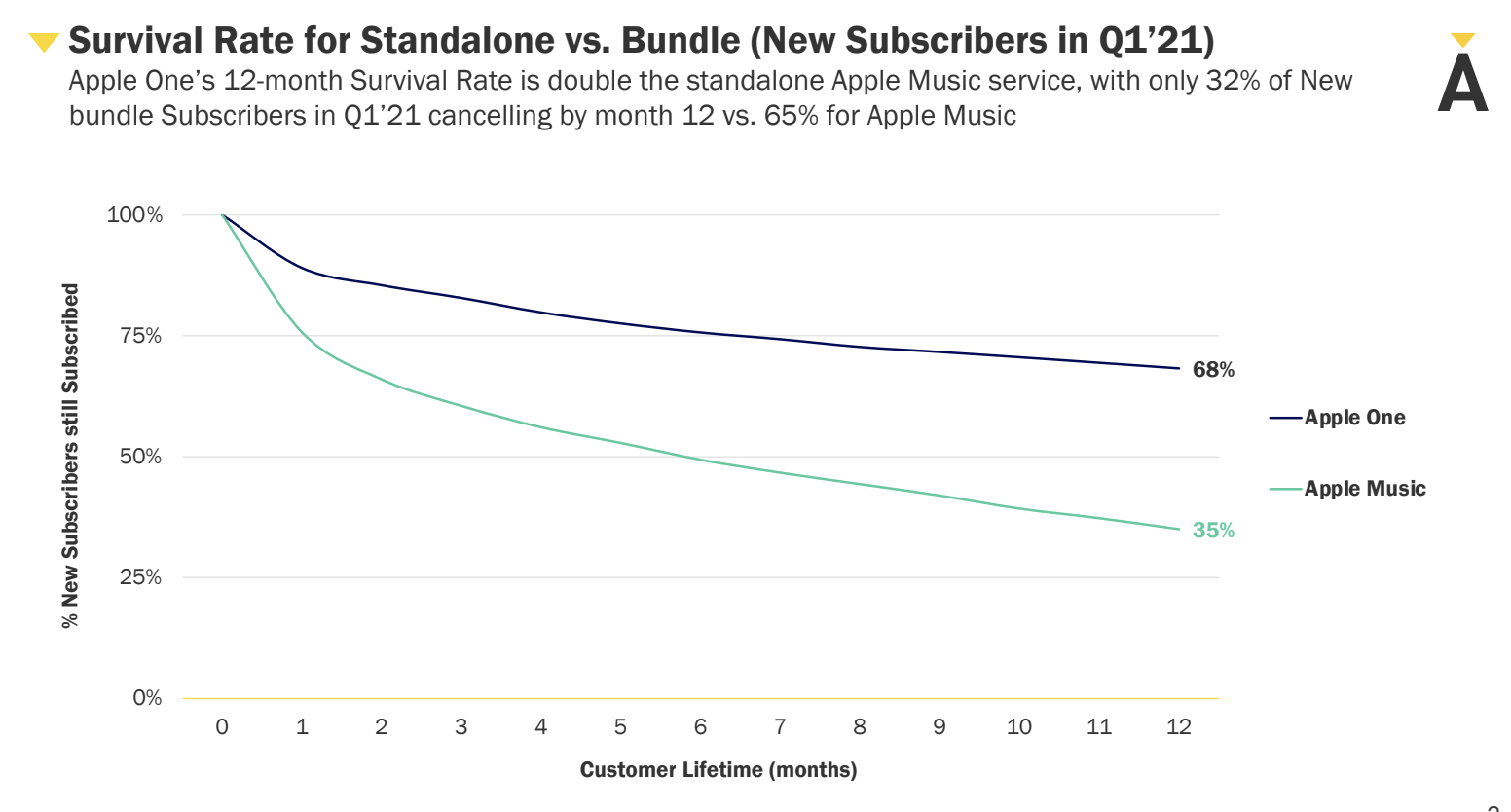 亚马逊和苹果将娱乐视为聚合器。他们的原创节目只是你从他们那里购买的更大套餐的一部分。这是苹果成功的关键。根据Antenna的数据,注册其六项服务(游戏、电视、音乐、云、新闻和健身)捆绑套餐的客户取消服务的可能性要小得多,而购买单项服务的人则相反。