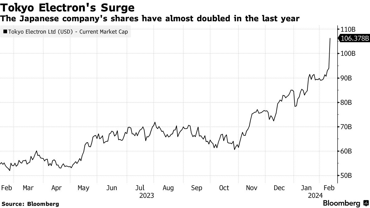 东京电子公司的市值周二增加了超过120亿美元,创下历史新高,原因是该公司提高了对中国销售的预期。
