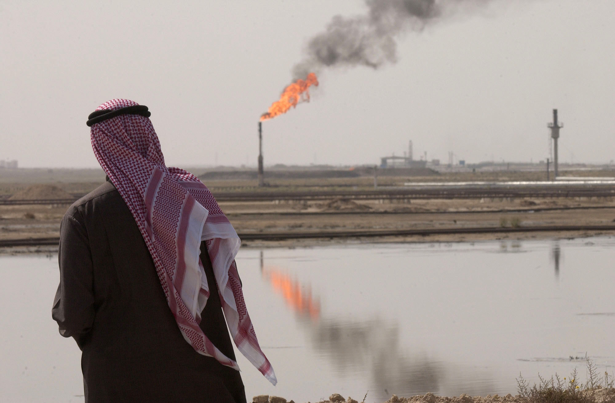 一名穿传统科威特服装的男子俯瞰布尔甘油田中的油湖。摄影师:丹尼尔·阿克