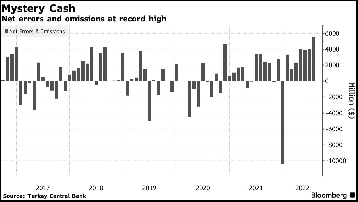 安卡拉的中央银行周一表示,7月份月度国际收支数据中无法解释的资金增至55亿美元。这使得今年头七个月的总额达到了244亿美元。 这两者都是纪录。