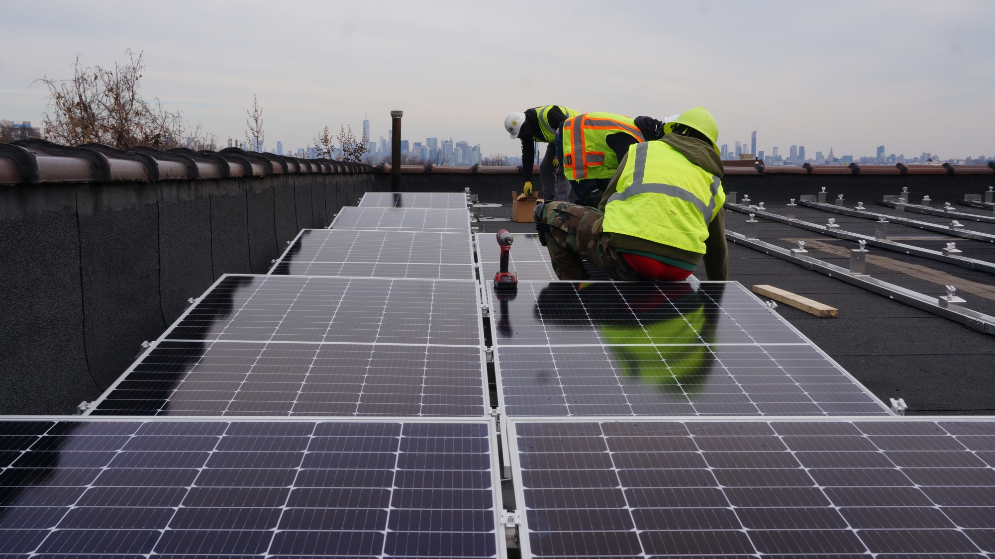 Upside Tech Alliance 公司 BlocPower 的民间气候军团工人们正在纽约史泰登岛的第一中央浸信会教堂安装太阳能电池板。