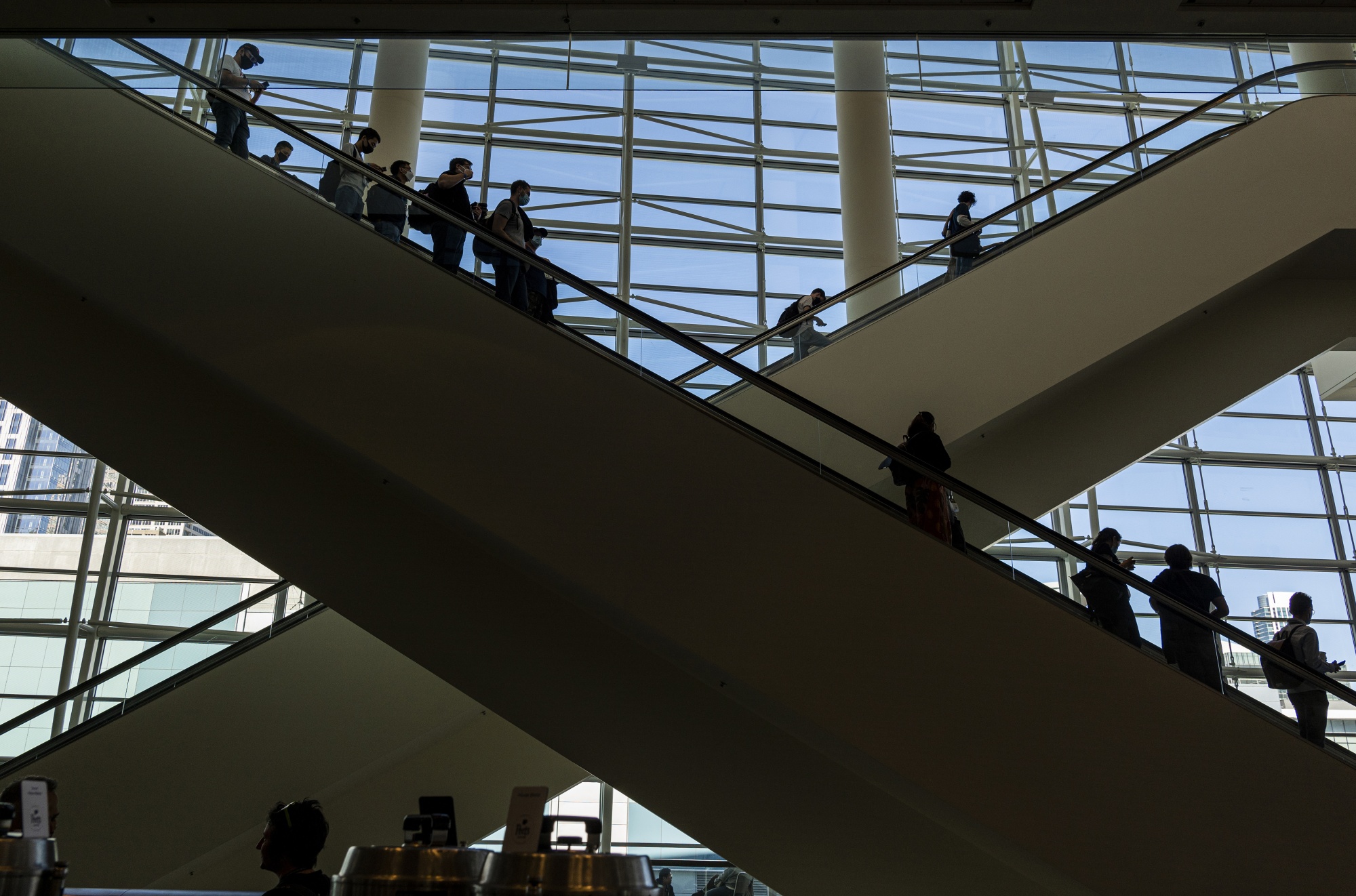 参展者在旧金山的一个展览大厅内乘坐自动扶梯。