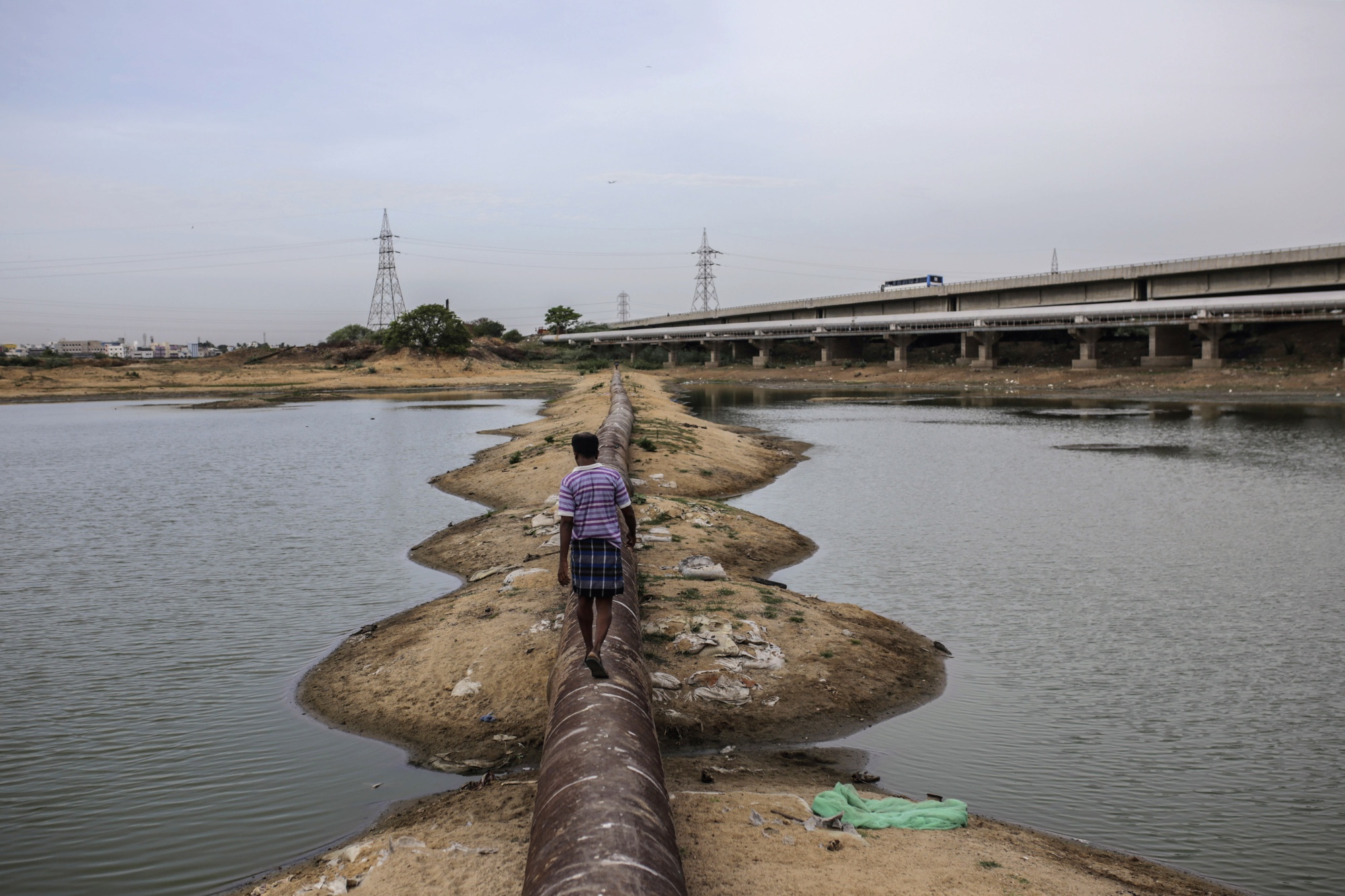 一名男子在印度金奈的波尔湖底部沿着水管走着。