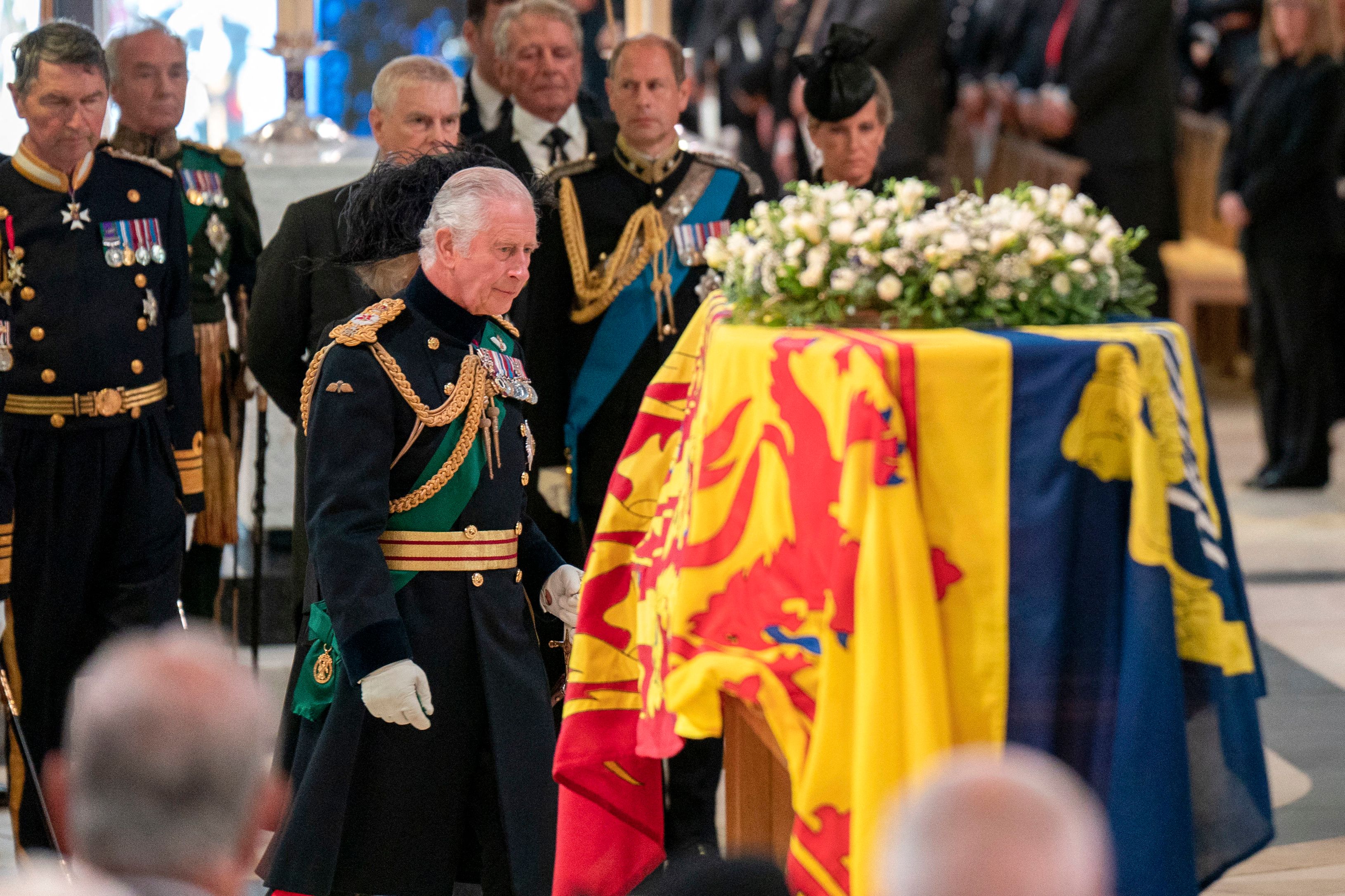 查尔斯三世国王在爱丁堡的圣吉尔斯大教堂内走近伊丽莎白二世女王的棺材,日期为9月12日。