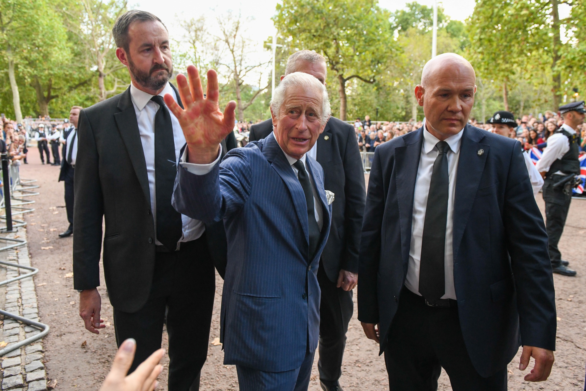 查尔斯三世国王在伦敦进行漫步时向祝福者致意,这是伊丽莎白二世女王去世后公众哀悼的第二天,日期为9月10日。