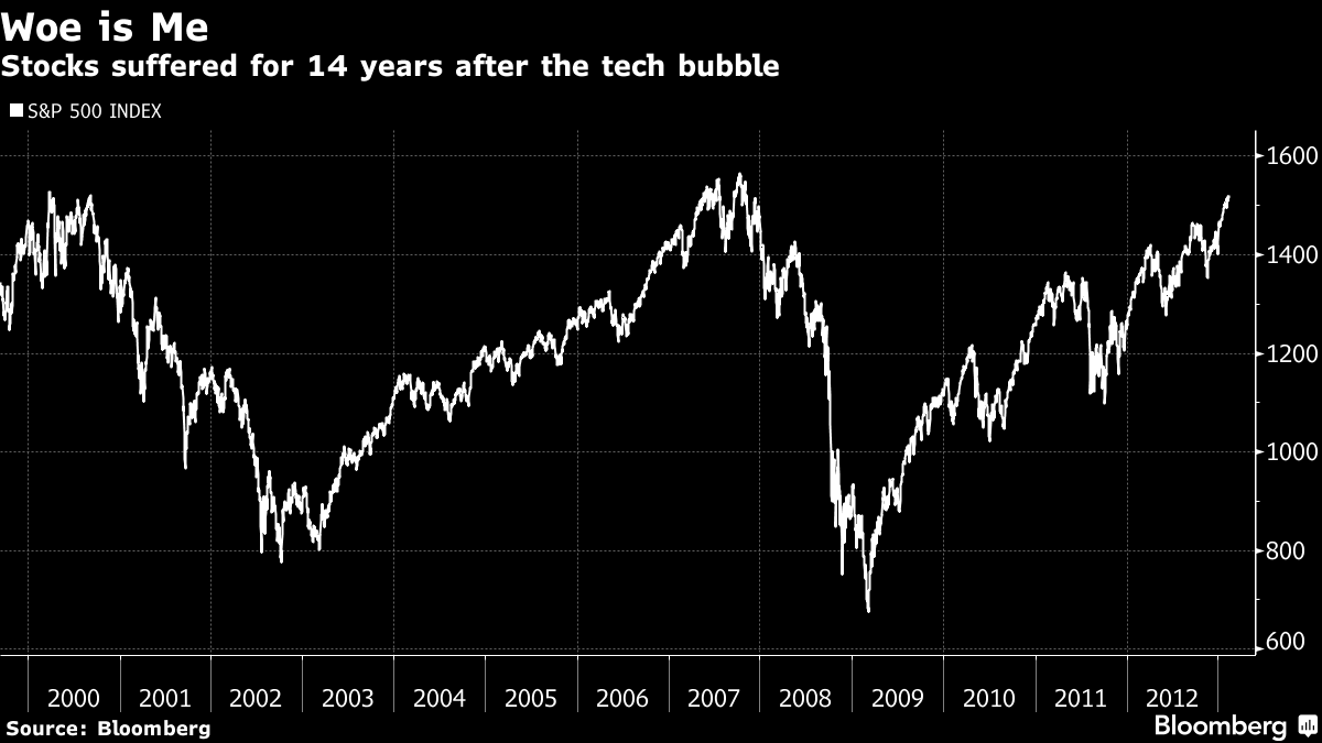 另一方面,如果你在1999年科技泡沫的顶峰持有标普500指数,你会在随后的熊市中损失近一半的资金。坚持到大金融危机结束后,你将在整整14年后才能收回本金。考虑到资产市场的泡沫程度——包括所有的热门股票和加密狂热——1999年也是一个有趣的历史对照。