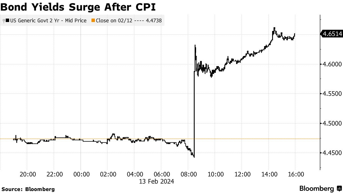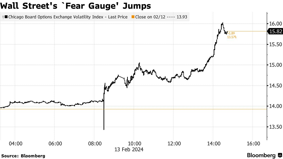 随着消费者价格指数全面超过预期,股市距离历史最高点下跌。国债抛售,两年期收益率达到去年12月央行“转向”前的最高水平。掉期交易商下调了他们对7月前美联储降息的预期。股市的“恐慌指数” — VIX — 自10月以来上涨最多。美国投资级企业债市场的 风险感知指标飙升 — 有 三家发行商被搁置。