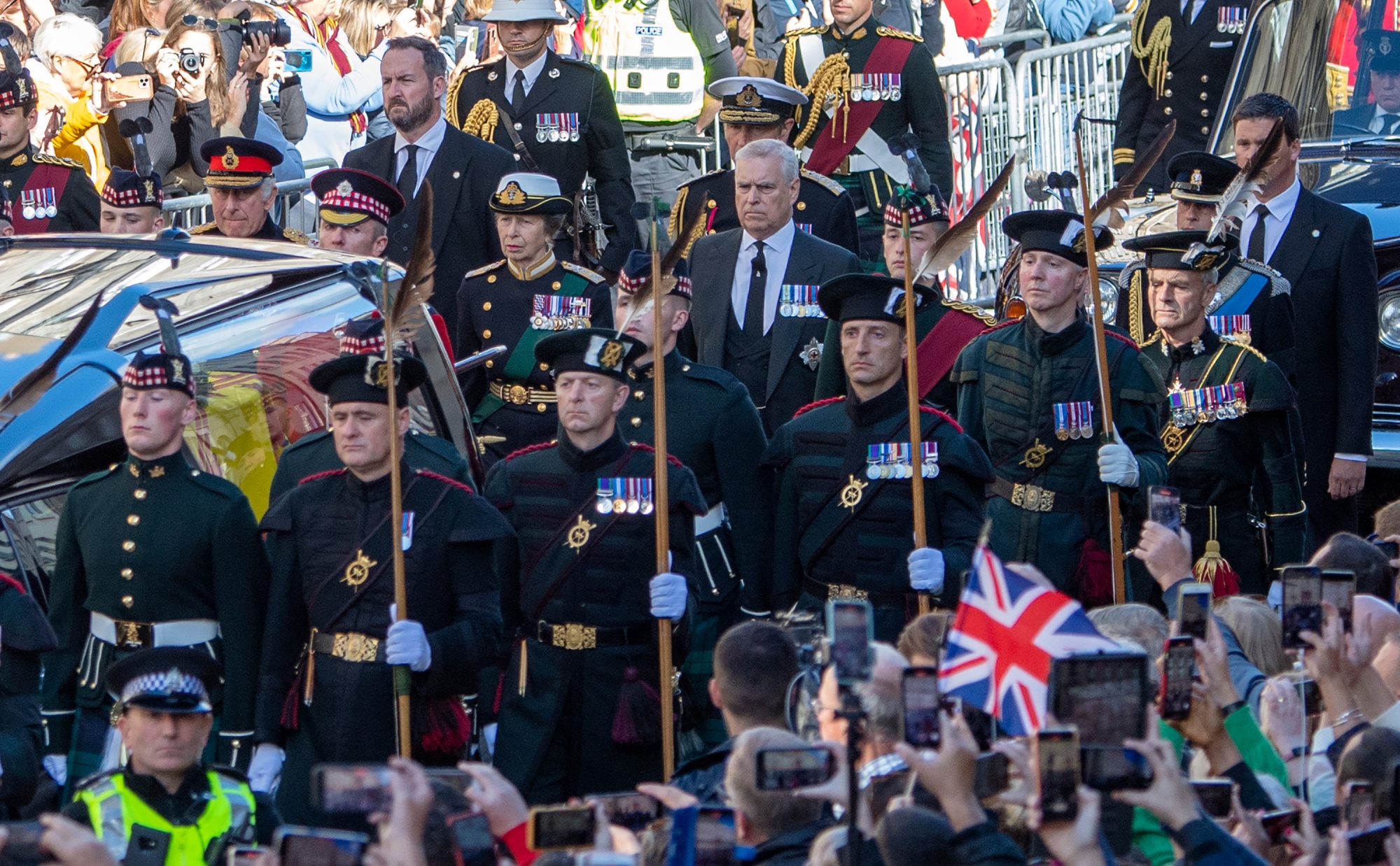 查尔斯三世国王、安妮公主、约克公爵安德鲁王子和约克公爵爱德华王子在苏格兰爱丁堡皇家里尔上跟随着搬运伊丽莎白二世女王棺材的灵车行走,时间是9月12日。