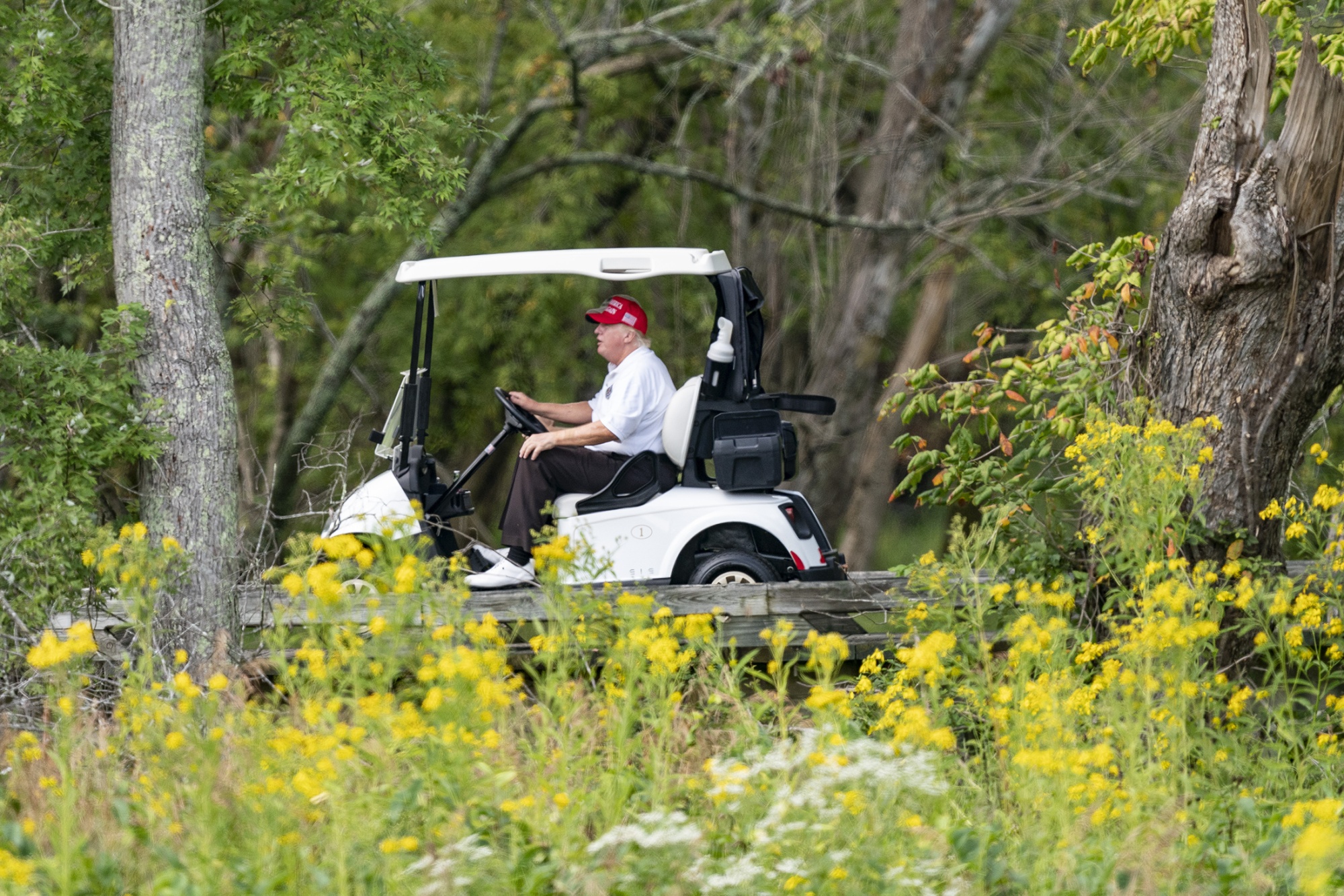 前总统唐纳德·特朗普在弗吉尼亚州斯特林的特朗普国家高尔夫俱乐部驾驶小车,日期为9月12日。
