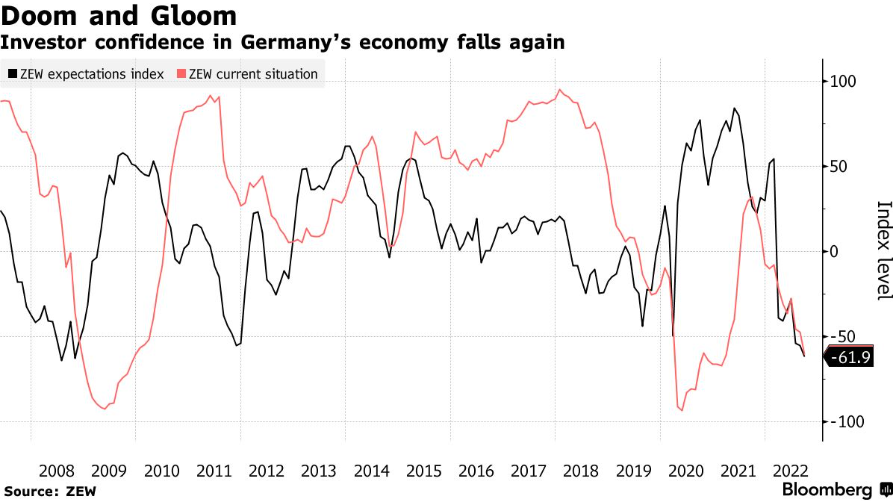 对德国经济的投资者信心,已经低于疫情低点,进一步恶化,因为担心冬季能源紧缩将引发衰退。 ZEW研究所的预期指数从上个月的-55.3下降到9月的-61.9,比经济学家的预期更糟糕。“冬季能源短缺的前景使德国工业的大部分预期变得更加负面,” ZEW主席阿希姆·瓦姆巴赫在一份声明中表示。
