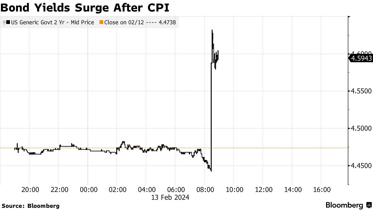 “我们认为今天超出预期的一月份消费者价格指数报告对美联储降低通胀的努力是一个负面因素。如果就业市场和/或经济开始显著放缓,美联储目前的联邦基金利率在525-550之间,但目前,由于更高的消费者价格指数读数、强劲的经济和通胀超过目标,他们最有可能的行动是至少等到五月/六月。”