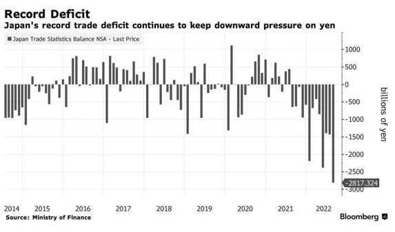 从盈余到赤字 | 日本的贸易逆差在八月扩大到创纪录水平,因为日元疲软推高了大宗商品进口的价值。财务省周四报告称,未经调整的贸易逆差扩大到2.82万亿日元(197亿美元),这是自2015年以来的最长连续13个月处于赤字。进口价值较去年同期增长了49.9%,达到历史新高,而出口增长了22.1%。(阅读完整报道 这里*。)*
