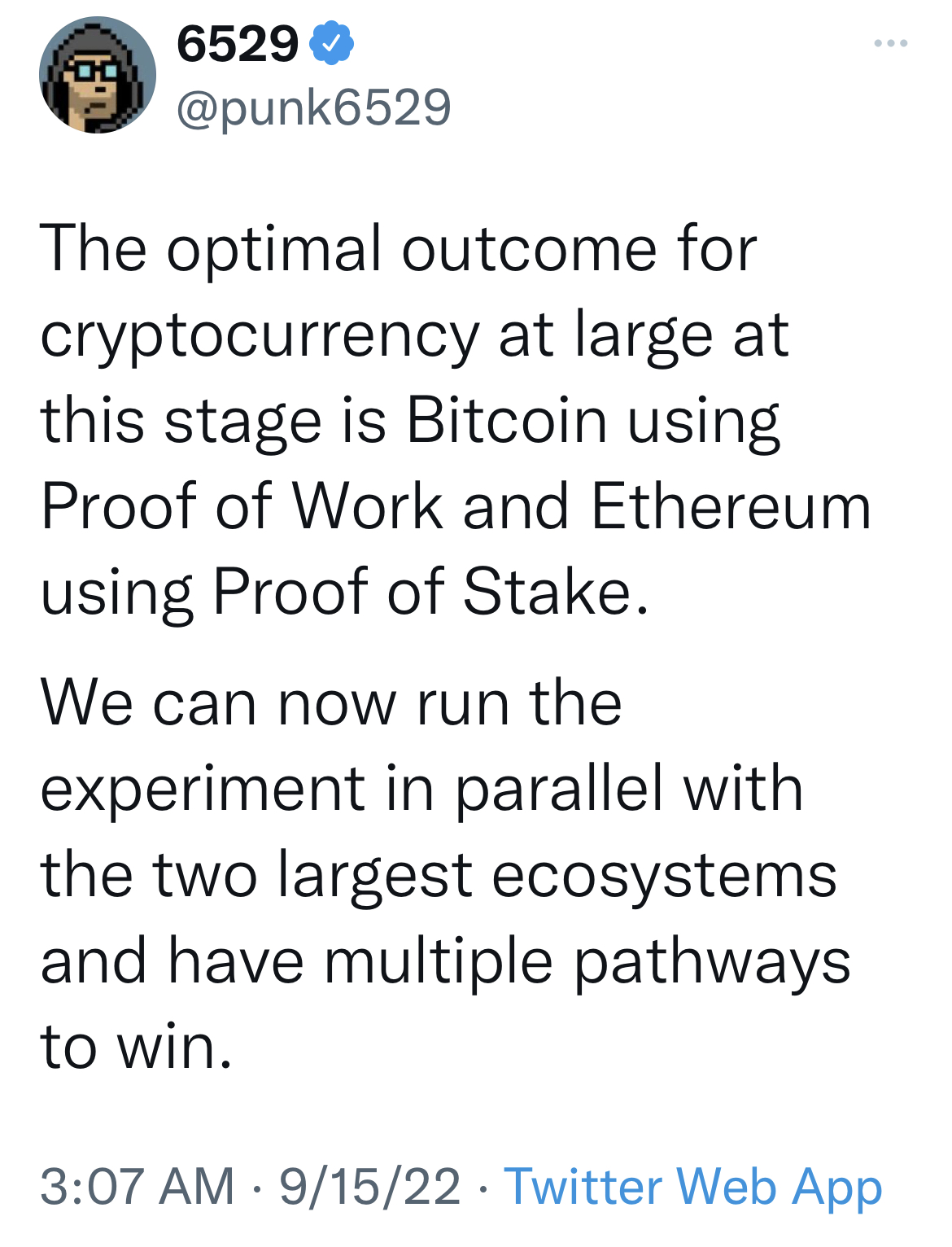 来源: @punk6529](https://twitter.com/punk6529/status/1570308371995328512)然而,最终可能不是由比特币持有者决定。现在以太坊已经证明了一个主要网络可以转向权益证明,监管机构可能很快会寻求对其他区块链施加压力。随着世界对气候危机越来越关注,投资者将更加严格地选择符合其投资组合标准的资产。如果比特币不被规则强制升级,也许不断增加的现金流和市场份额流向以太坊将迫使其自行转变。