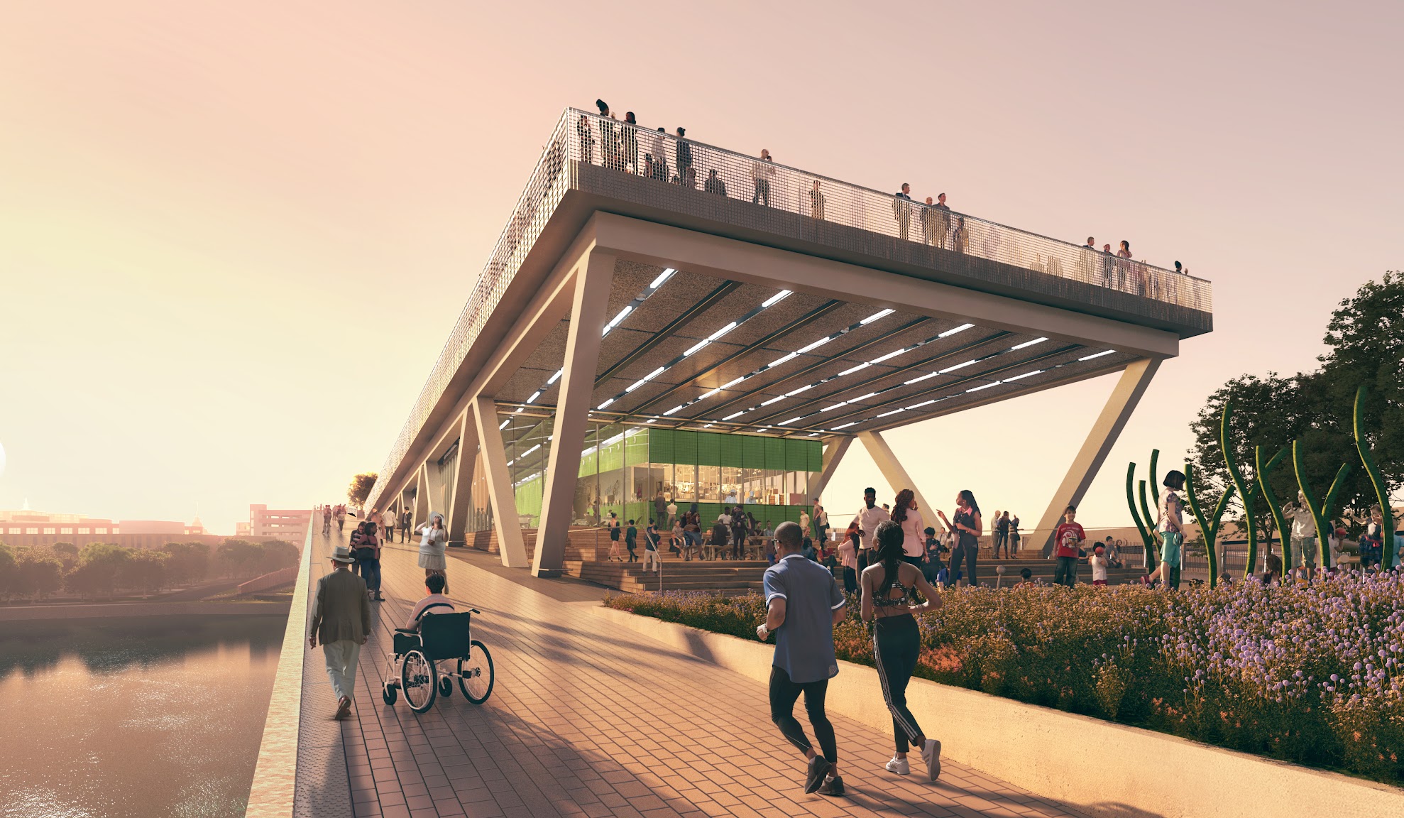 一个由安纳科斯蒂亚流域协会管理的新教育中心将会运营。照片:OMA+OLIN9月15日,11th Street Bridge Park背后的利益相关者将在社区会议上展示关于计划的新细节。组织者从美国商务部获得了600万美元的拨款,推出了一个由非营利组织 安纳科斯蒂亚流域协会 运营的环境教育中心。公园设施将展示展览,接待学校团体,并促进户外示范;毗邻的皮划艇和独木舟启动区将让游客亲身体验该组织恢复河流、滨水和湿地的努力。