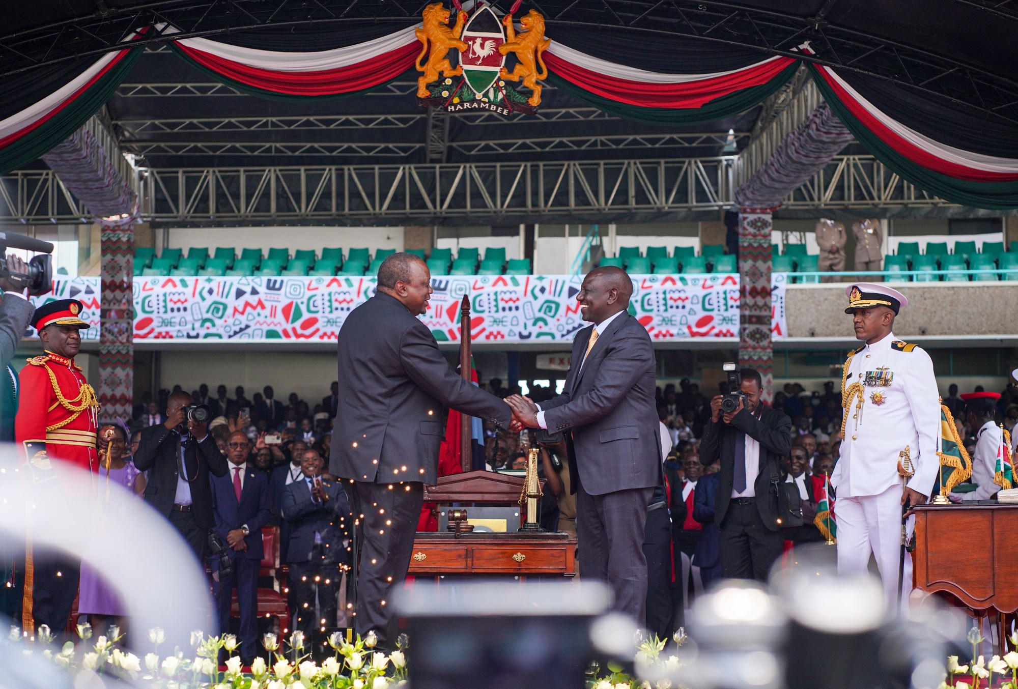 新当选的肯尼亚总统威廉·鲁托(右)和他的前任乌呼鲁·肯雅塔在周二内罗毕的就职典礼上。摄影师:弗雷德里克·勒内里德/彭博社### 本周解说