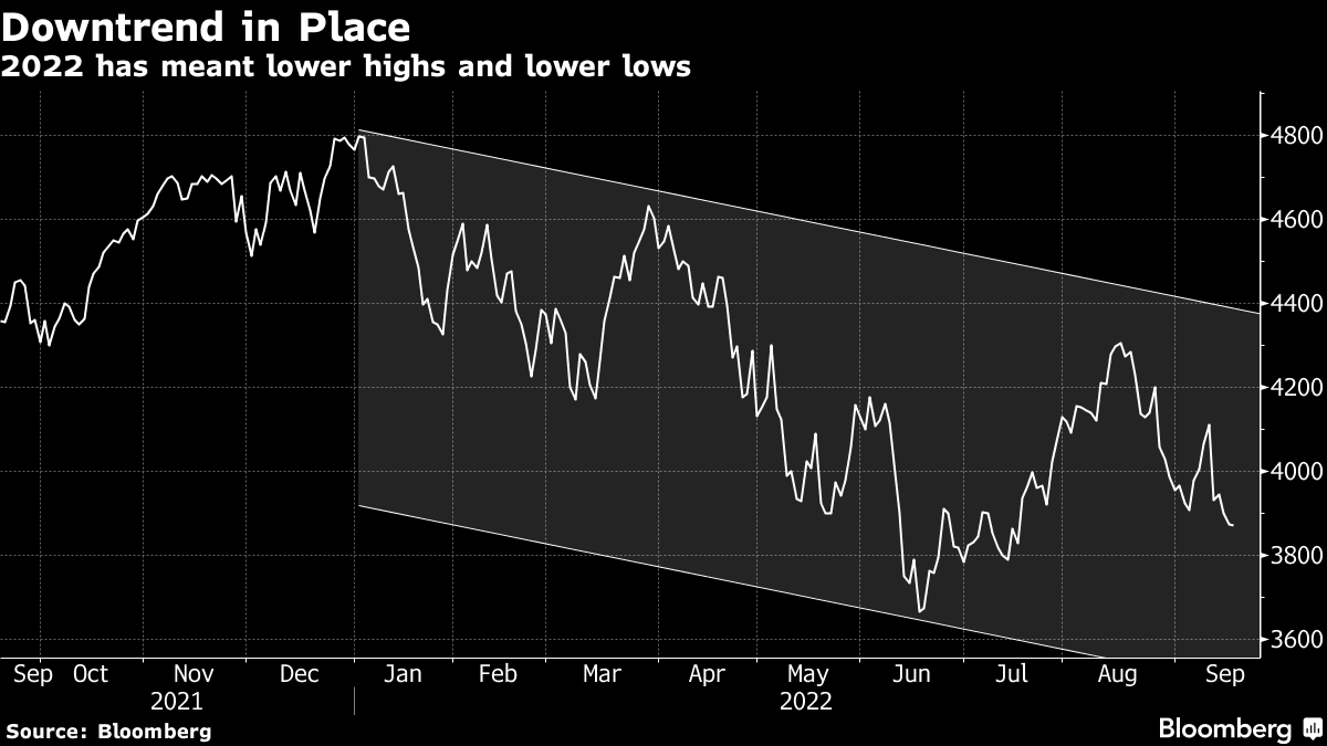最终,联邦储备委员会对通胀的打击推高了利率,同时压低了未来收益的价值,而未来收益的前景已经变得黯淡。这对收益和应用于它们的折现率构成了双重打击,导致股市出现了低低点和低高点的趋势。