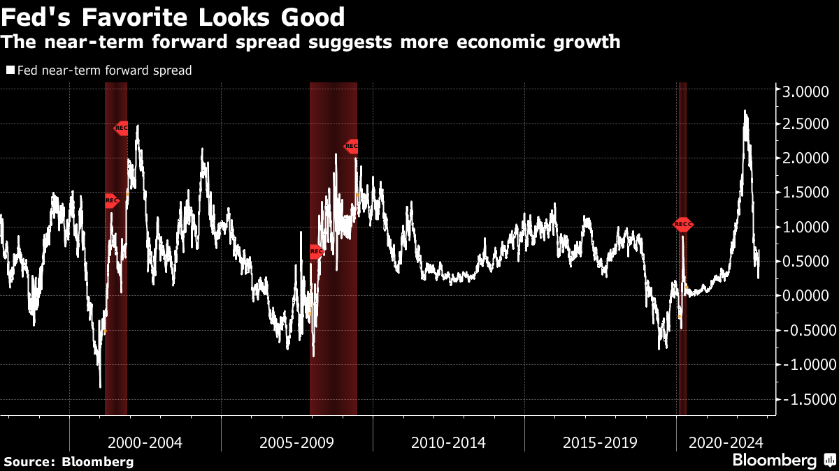 美联储必须感到有操作空间,因为3个月国库券和预期18个月后的3个月利率之间的差距接近零 — 被称为短期前瞻收益率差距。这个指标已经成为央行的最爱。美联储主席鲍威尔甚至表示,它包含了“100%的收益率曲线的解释能力”。这是一个相当大的说法。因此,我们应该密切关注这个指标。它告诉美联储它有多少紧缩空间,因为它在市场衰退的背景下具有很好的回测效果。