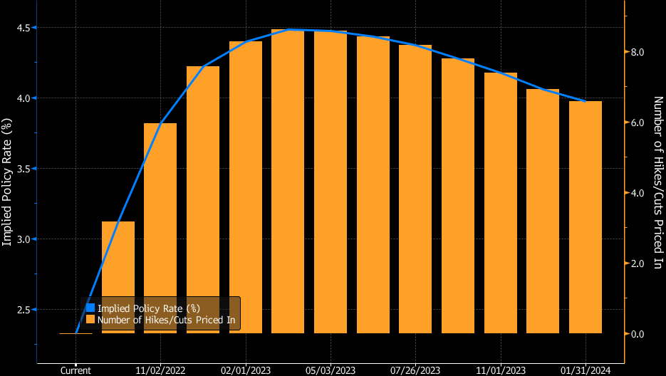 自那时以来,对美联储收紧政策的预期大幅上升,目前已经定价到2023年3月将近4.5%。因此,市场已经对这一点做出了反应。尽管一系列美联储官员表示在达到最高利率后,利率将保持较高一段时间,但利率期货显示美联储将在2023年削减半个百分点。