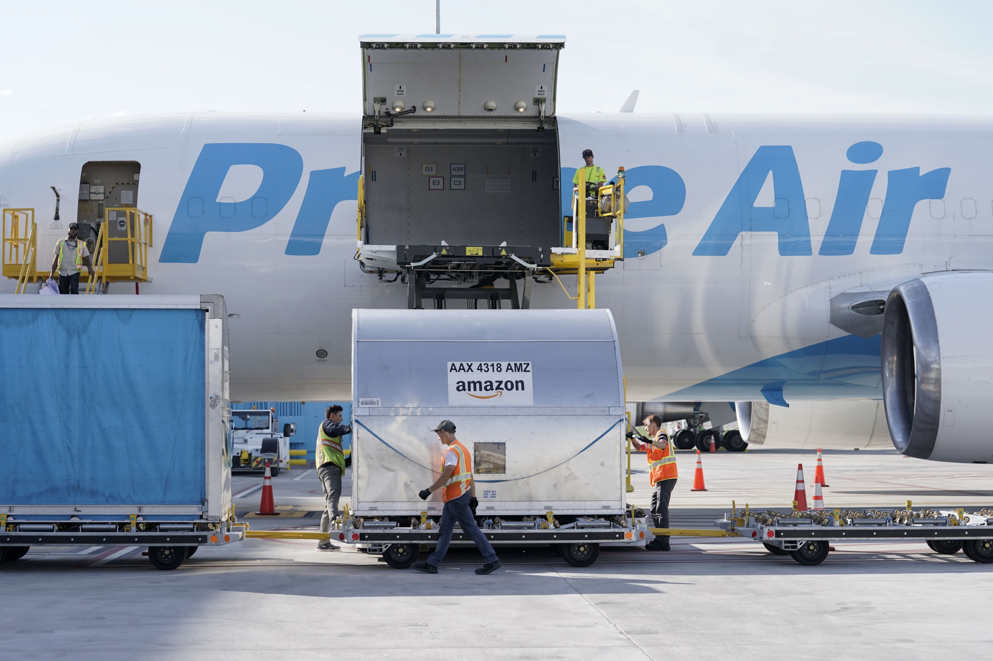 地勤人员正在将货物装上亚马逊Prime Air飞机,该飞机停靠在位于肯塔基州希布伦的亚马逊航空枢纽。