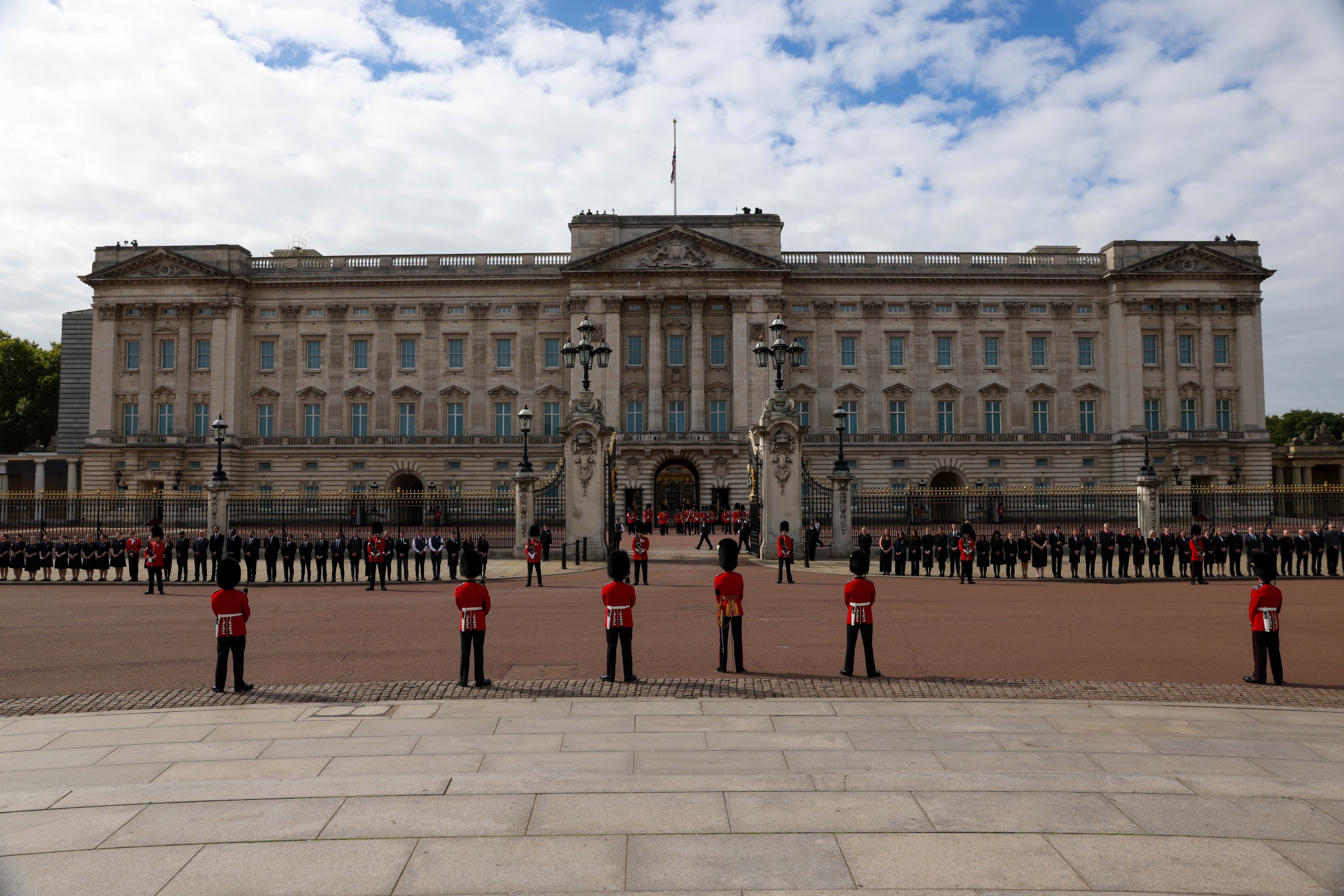白金汉宫的员工在伦敦,英国,9月19日举行的伊丽莎白二世女王国葬的队列路线上排队。