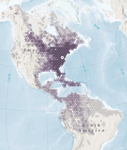来自华盛顿特区迁徙的300多种鸟类的起点和终点。来源:国家奥杜邦协会如果我查看 黑脸林莺,它是北美唯一一种迁徙路线最长的林莺,地图显示了一群点在南美洲和加拿大、阿拉斯加的北方森林之间来回移动。