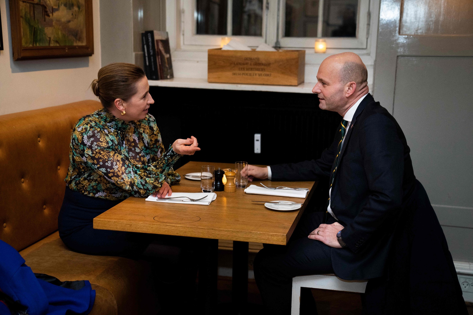 索伦·帕佩·普尔森(Soren Pape Poulsen)右边,与梅特·弗雷德里克森(Mette Frederiksen)在丹麦哥本哈根,2022年2月。摄影师:马丁·西尔维斯特/法新社/盖蒂图片社