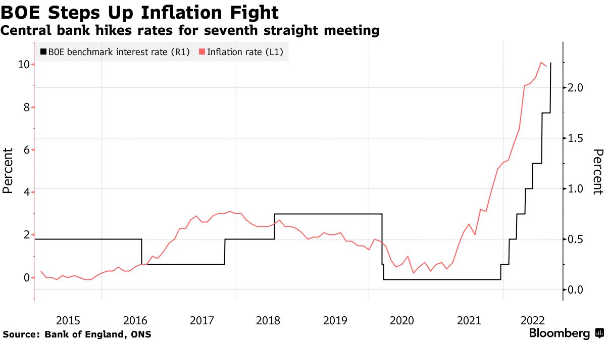 英格兰银行再次加息。总共,大约有90家央行 — 从乌兰巴托到华盛顿,正如我们的团队所说 — 今年已经提高了利率,迄今为止超过了700个基点。