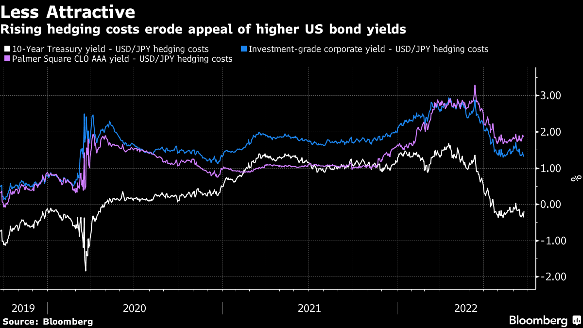 对抗不断上涨的美元,对冲日元成本飙升仍然对固定收益的许多领域构成威胁,特别是国债领域,数学不再合理。通过常用的3个月远期汇率对冲,10年期国债的有效收益率已经再次降至负值,对于日本买家来说是一个威胁,他们是最大的外国持有者,本月对冲外汇的成本已飙升至自2008年10月以来的最高水平。相比之下,同期限的日本国债收益率为0.23%,对于本地投资者来说是一个更好的选择。