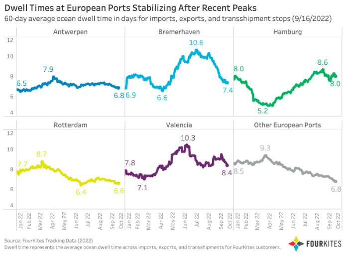 在欧洲,需求放缓正在缓解港口拥堵问题 — 至少目前是这样。以下是FourKites如何量化过去几个月集装箱平均滞留时间改善的方式: