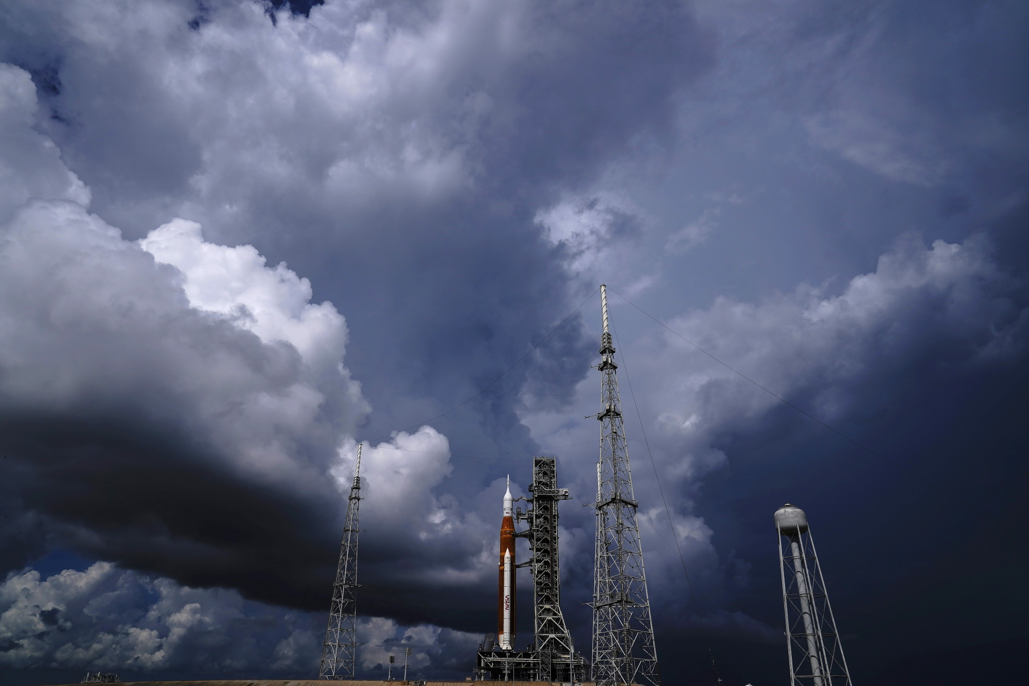 美国宇航局的月球火箭站在39B发射台上,准备进行“阿尔忒弥斯1号”任务,绕月飞行,地点:佛罗里达州卡纳维拉尔角,肯尼迪航天中心,2022年9月2日星期五。2022年9月23日星期五,加勒比海的一场风暴威胁着推迟美国宇航局第三次发射火箭的尝试。(美联社图片/布林·安德森,文件)