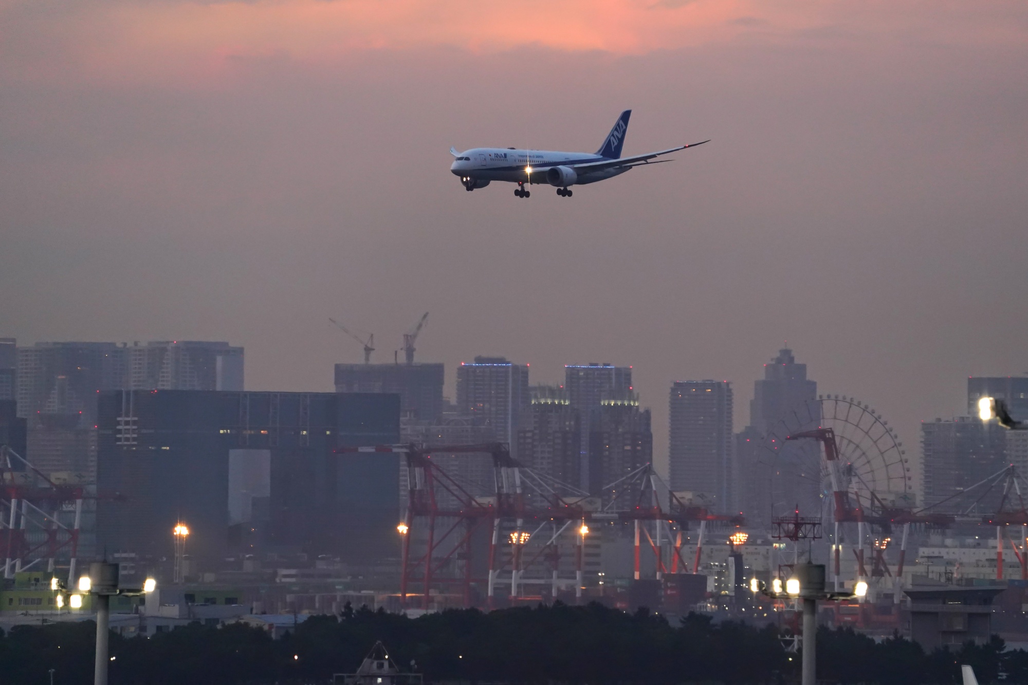 一架由全日空运营的飞机正在接近东京羽田机场。