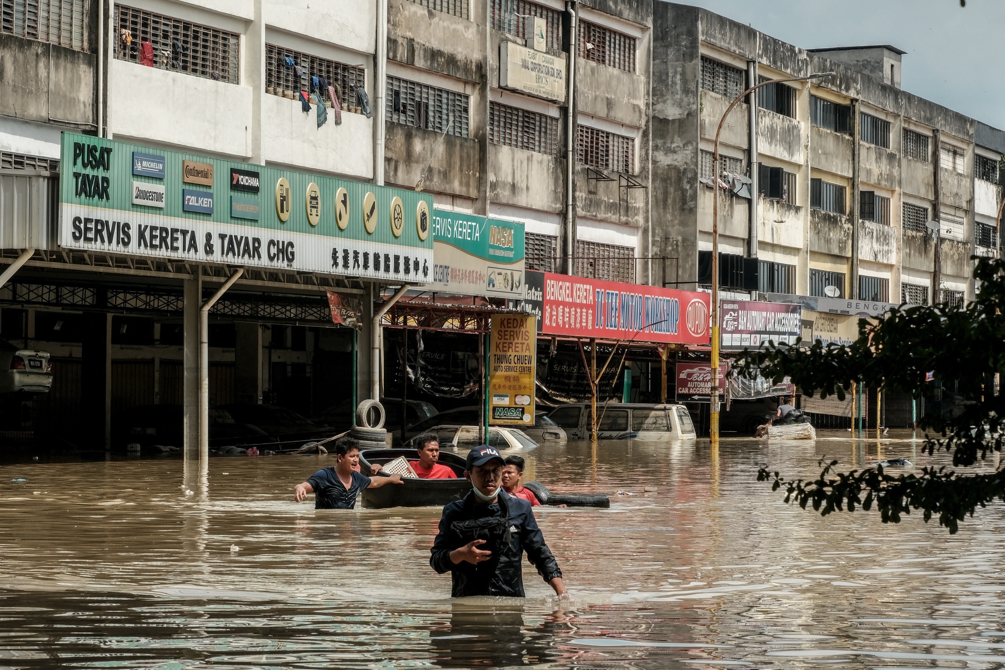 马来西亚雪兰莪州沙亚南的Taman Sri Muda镇发生了洪水,2021年12月。